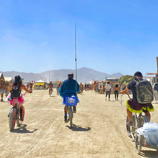 The next day I got up and had my first volunteering shift with Arctica, this is the only place where sales take place on the playa. Selling ice was quite the party. After shift I set out to find a camp that I had no idea the name of, I was simply looking for a guy named Owl. Burning man 2018, I had met Owl who was a firefighter from Oregon. I told him then I was testing with cities in Phoenix and was thinking of giving up on the hiring process. He did a tarot card reading and told me that I needed to try one more time. Sure enough I got hired on the next test. I finally found camp Gypsy Nebula and connected with his campmates who informed me he wasn't burning this year. Karli and I rode around the rest of the day checking out all the art.