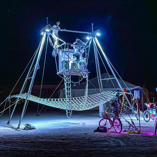 As I arrived at gate on Friday around 8pm, I joined the longest line I have had. It took me til 3:30am to get to my camp. I unloaded the trailer and took a nap in the trailer til the sun and heat woke me up. Once up, I began to build camp with the help of Amber, one of my campmates who also had early entry. Once we got done setting our shade structures and building camp, the first white out rolled in. The visibility was no more than 10 feet. Everything was playafied within minutes of finishing. I began to journey on playa to find some dear friends. First person I can across was Scott from work who just so happened to be our neighbor. I ran into so many friends along the way. It was interesting to be on playa before opening and see how much was built before everyone began to arrive through the week. That first night I went out with my Palm Springs Burner friends. We visited the man first, where we saw the first drone show of the burn. It's truly amazing to see what these drones were capable of. One of my favorite pieces of art "Paraluna" was not far so we pedaled over and laid under it for a while. This was an early night.